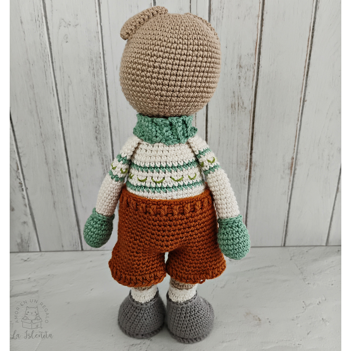 Osito amigurumi tejido a mano, creado con dedicación y cuidado en cada detalle. Su diseño dulce y atemporal, junto a su vestuario tejido, lo convierten en una pieza especial para acompañar, regalar o simplemente disfrutar.