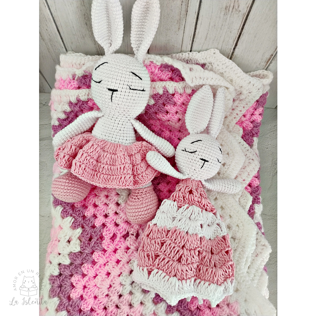 Set tejido a mano que combina suavidad y dedicación en cada detalle. Incluye una manta, una conejita amigurumi y una manta de apego, pensadas para acompañar con calma y ternura los primeros momentos.